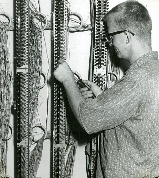 Panels such as this one, are installed in the telephone equipment rooms for all buildings using a large number of telephones. Installer-repairman Norman Smith is busy installing lines for new grandstand addition at race track.