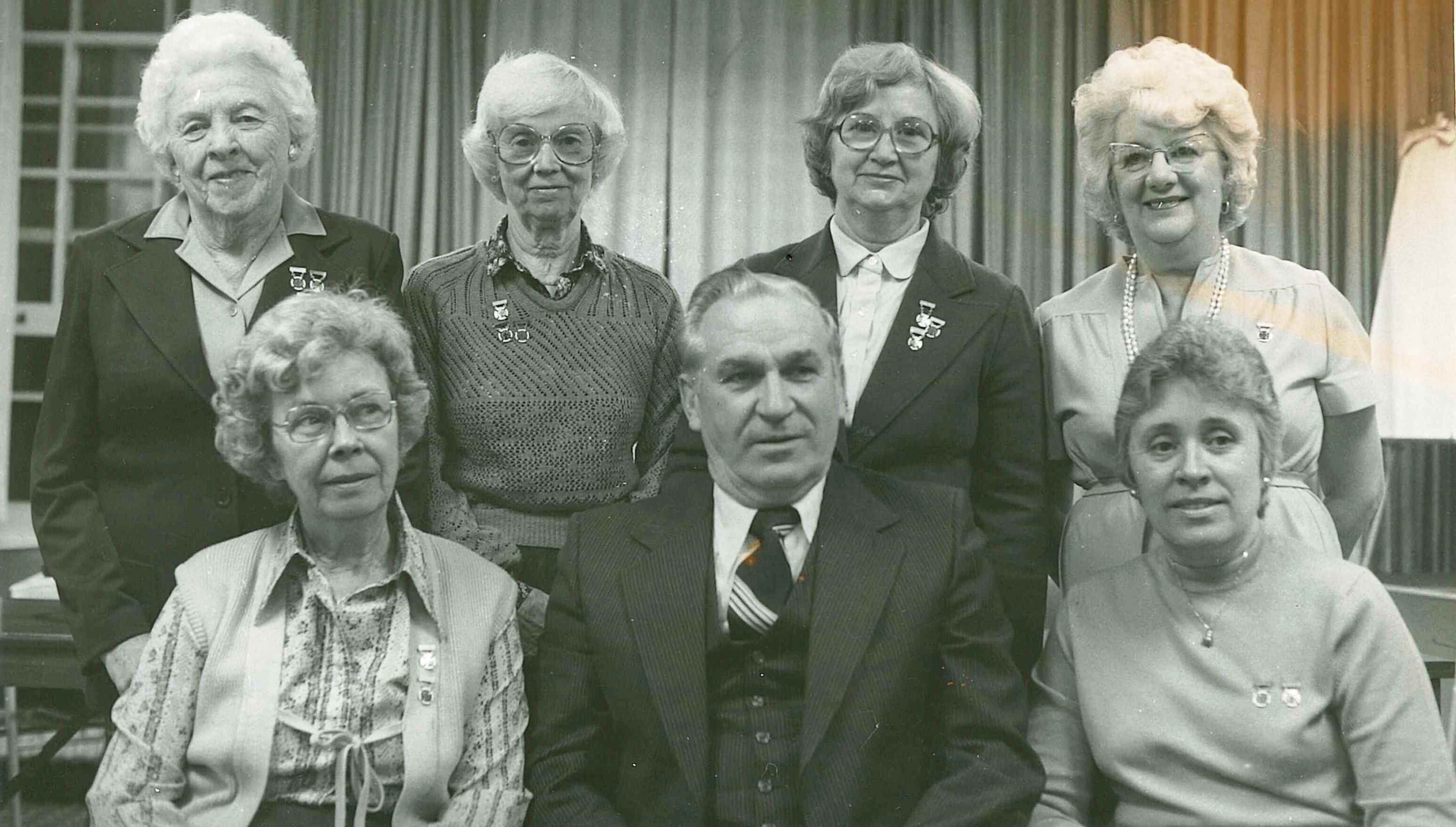 Memberships of Douglas Memorial Hospital Auxilary receiving Life Memberships are in the front row from the left: Gertrude Miller, Ken Stouffer, Sue Shaw, Margeurite Von Zuben, Ivy Standing, Mildred O'Brien and Audrey Deterling.
