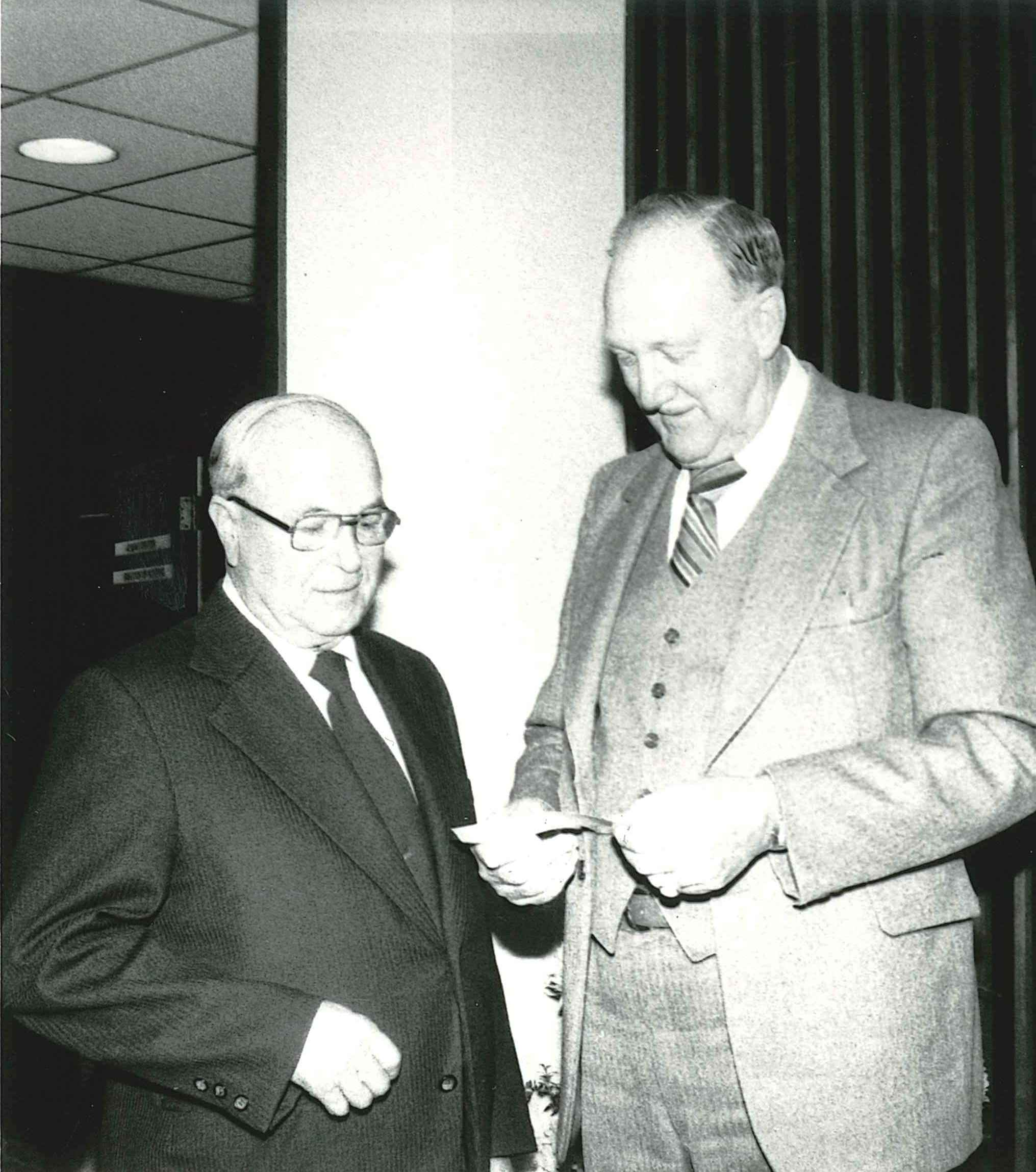 Louis Climenhage, left, was the president of the Fort Erie Historical Society, and presented a cheque to Willis Thompson for over one thousand dollars to Douglas Memorial Hospital.