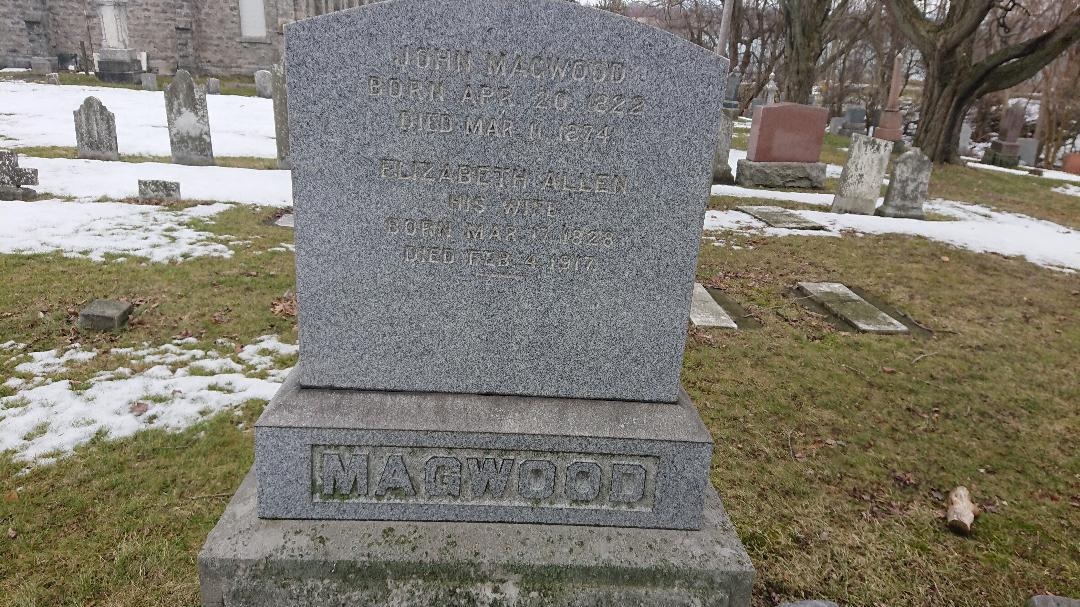 Pictured here is the grave of Elizabeth Magwood. She is buried with her husband John. Her grave is located on the west side of St. Paul's Anglican Cemetery.
