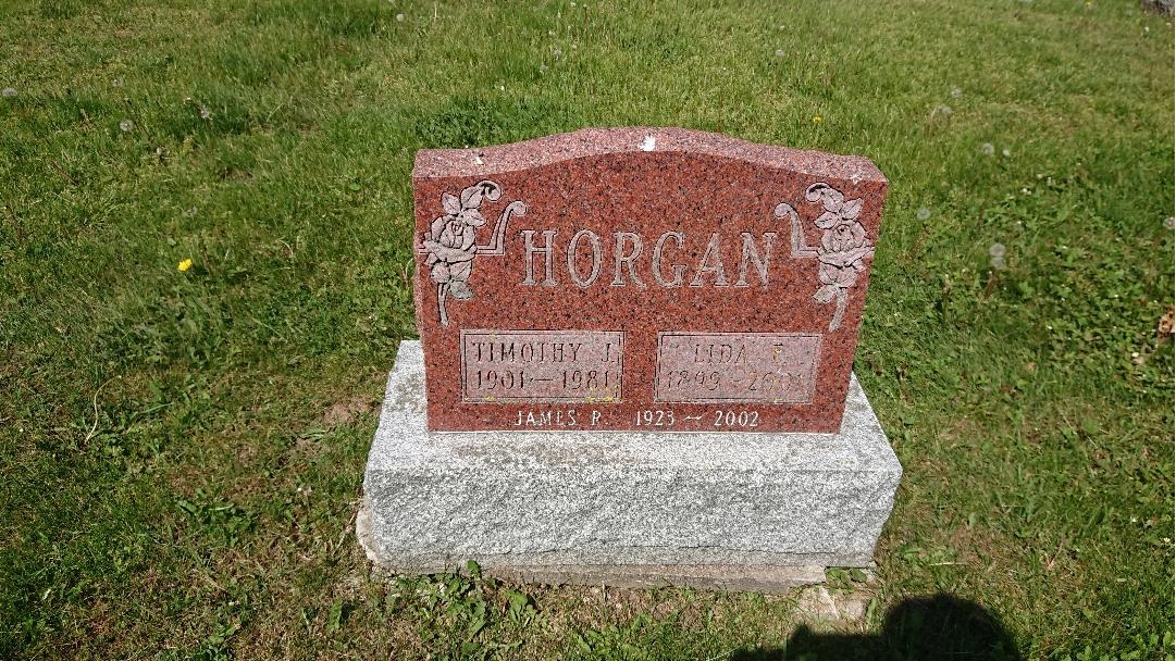 Pictured here is the grave is Lida Horgan. She is buried with her husband Timothy and son James. Her grave is located on the south side of McAfee Cemetery.